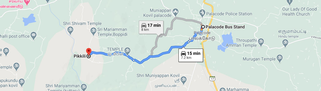 பிக்கிலிக்கு மிக அருகில் உள்ள ரயில் நிலையம் பாலக்கோடு ரயில்வே நிலையம்.